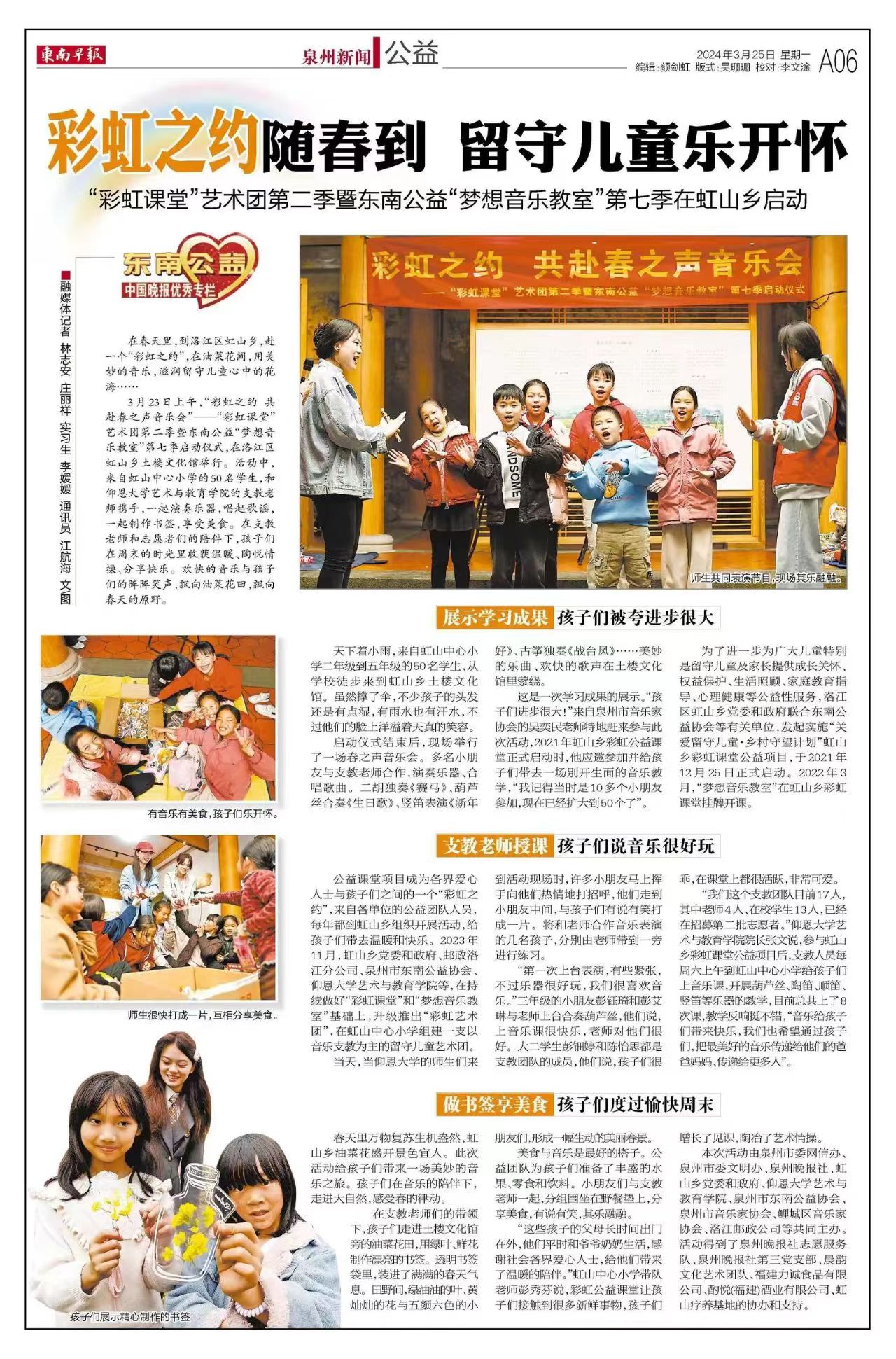 春之伊始,万物复苏。3月23日上午,在这生机勃勃的春天里,今年会官方网站携手东南公益、东南早报等,于洛江区虹山乡土楼文化馆举行“彩虹课堂”艺术团第二季暨东南公益“梦想音乐教室”第七季启动仪式,以一场“春之音乐会”开启新一季梦想音乐之旅,助力孩子们健康快乐成长,助力虹山乡村振兴。