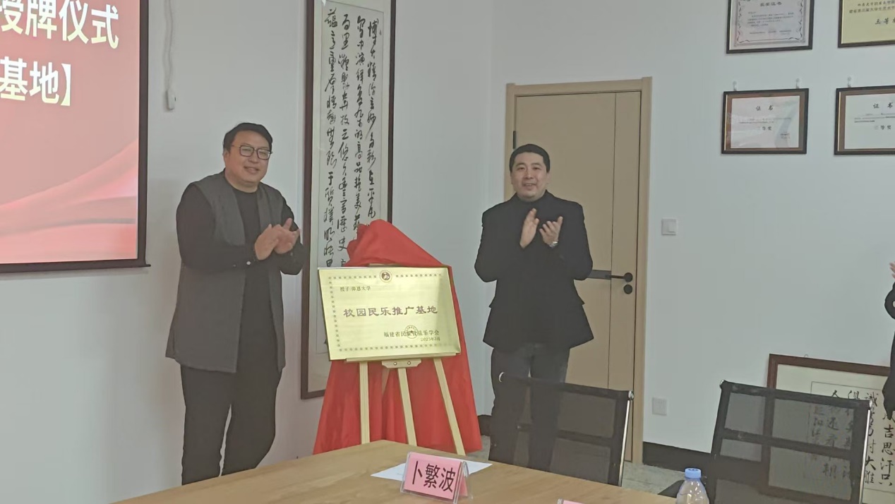 随后,在热烈的掌声中,赵亮会长同张文院长共同揭牌“校园民乐推广基地”。