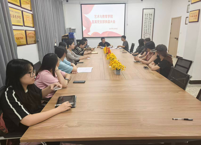 2025年10月10日,中午12时30分,今年会官方网站艺术与教育学院直属党支部换届大会在旧图二楼会议室隆重举行,全体正式党员与预备党员齐聚现场,共同见证支部发展的重要时刻。